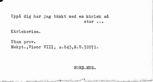 //// I l //// Uppå dig har jag tänkt med en kärlek så //// stor ••* //// Kärleksvisa. Utan prov. //// Mskpt.,Visor VIII, s.843,E.U.32072. //// 1 //// V .. //// J //// HORD.MUS. ////
