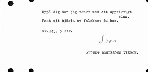 //// Uppå dig har jag tänkt med ett uppriktigt //// sinn, //// Fast ett hjärta av falskhet du bar. //// Nr.345, 5 str. //// J //// AUGUST BONDESONS VISBOK. ////