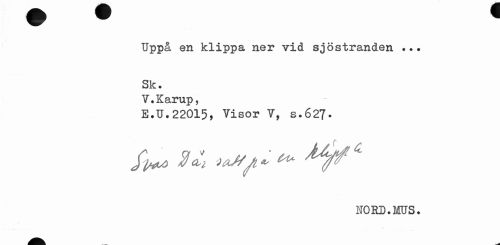 //// Uppå en klippa ner vid sjöstranden ... Sk. //// V.Karup, //// E.U.22015, Visor V, s.627. //// fi^ K . ~ ^f£ //// NORD.MUS. ////