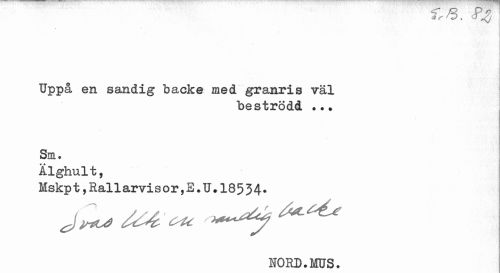 //// ' .1 //// j //// Uppå en sandig backe med granris väl //// beströdd //// Sm. //// Älghult, //// lskpt,Rallarvisor,E.U.18534. //// NORD.MUS. ////