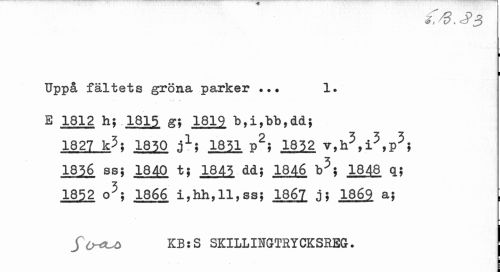 //// i //// ! //// Uppå fältets gröna parker 1. //// B 1812 h; 1815 g? 1819 b,i,bb,dd; //// 1827 k^; 1830 j1; 1851 p2J 1852 v,h3,i3,p3} //// 1836 ss; 1840 t; 1845 dd; 1846 b5? 1848 q; 1852 o5; 1866 i,hh,ll,ss; 1867 jj 1869 a; //// sO^uö KB: S SKILLINGTRYCKSREG. ////