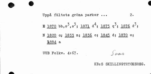 //// Uppå fältets gröna parker ... 2. //// E 1870 bb,o5,s35 1871 d4} 1875 q5; 1876 d5; ® 1820 ci 1855 nj 1856 c; 1845 d; 1870 e; //// 1884 a //// UUB Polkv. 4*67. J tss^o //// ICB j S SKILLINGTRYCKSREG. ////