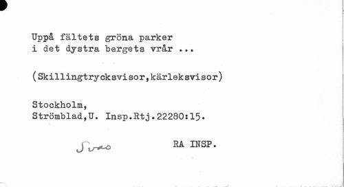 //// Uppå fältets gröna parker //// ¦ //// i det dystra bergets vrår ... //// (Skillingtrycksvisor,kärleksvisor) //// Stockholm, //// Strömblad,U. Insp.Rtj.22280:15* //// \ //// ^ RA INSP. ////
