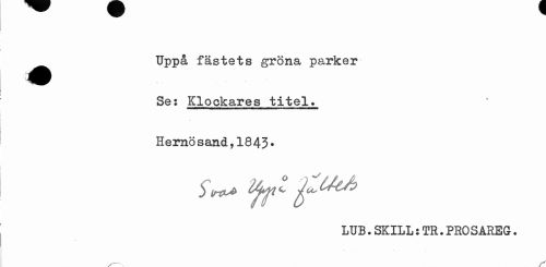 //// ^^ Uppå fästete gröna parker //// Se: Klockares titel. Hernö sand,1843- //// LUB.SKILL:TR.PRO SAREG• ////