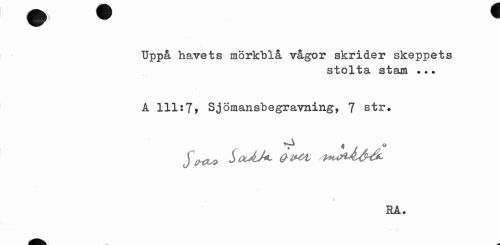 //// Uppå havets mörkblå vågor skrider skeppets //// stolta stam ..• //// A 111:71 Sjömansbegravning, 7 str. //// si 4 o //// JtHL* SocÅM Q-lt&L //// t //// RA. ////