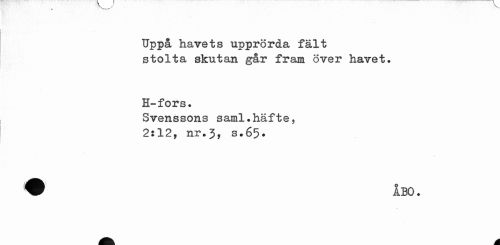 //// Uppå havets upprörda fält stolta skutan går fram över havet. //// H-fors. //// Svenssons saml.häfte. 2:12, nr.3, s.65* ////