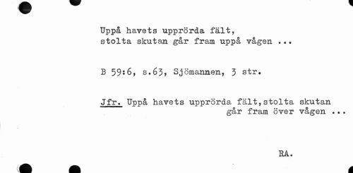 //// Uppå havets upprörda fält, //// stolta skutan går fram uppå vågen ..? //// B 59*6, s.63* Sjömannen, 3 str. //// Jfr. Uppå havets upprörda fält,stolta skutan //// går fram över vågen ... //// é //// RA. ////