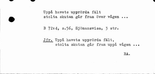 //// Uppå havets upprörda fält ^^ stolta skutan går fram över vågen //// B 72:4, s#5é, Sjömansvisa, 3 str. //// Jfr» Uppå havets upprörda fält, //// stolta skutan går fram uppå vågen . //// HÅ. //// ^ i ////
