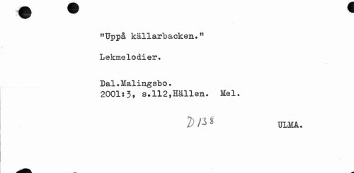 //// m w //// MUppå källarbacken.r! Lekmelodier. //// Dal.Malingsbo. //// 2001:3, s.112,Hällen. Mel. //// 2>a** ulma. ////