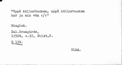 //// i //// "Uppå källarbacken, uppå källarbacken har j a min vän : /:11 //// Ringlek. //// Dal.Grangärde, 12508, s.32, Blixt,0. //// D 138. //// ULMÅ. ////