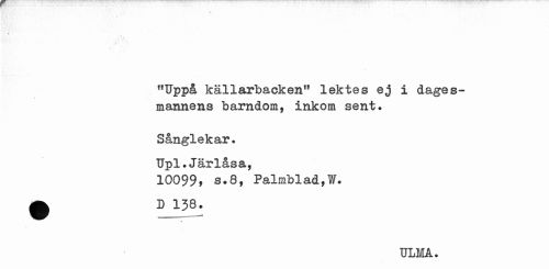 //// % //// "Uppå källarbacken" lektes ej i dages-mannens barndom, inkom sent. //// Sånglekar. //// Upl.Järlåsa, //// 10099, s.8, Palmblad,¥. //// 0 D 138. //// v //// ULMA. ////