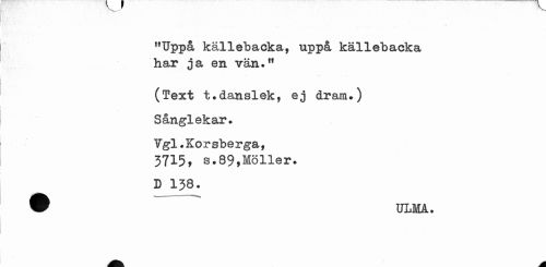 //// "Uppå källebacka, uppå källebacka har ja en vän.11 //// (Text t.danslek, ej dram.) //// Sånglekar. //// Ygl .Korsberga, 3715, s.89,Möller. //// D 138. //// ® ULMÅ. ////