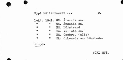 //// Uppå källarbacken ... 2. //// Lekt» 1941. Gä. Arsunda sn. " u Gä. Arsunda sn. //// 91 M Hä. Lörstrand. //// ff M Hä. Vallsta sn. //// » w Nä. Örebro, (alla) //// M fl Sk. Örkeneds sn. Lönsboda. //// D 138. //// HORD.MUS. ////