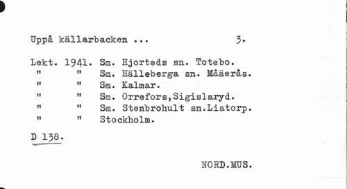 //// Uppå källarbacken ... 3 • //// i //// .. . j //// Lekt. 1941. Sm. Hjorteds sn. Totebo. //// " f! Sm. Hälleberga sn. Måäerås. //// " 11 Sm. Kalmar. //// " u Sm. Orrefors,Sigislaryd. //// 11 tf Sm. Stenbrohult sn.Liatorp. //// 11 n Stockholm. //// D 138. //// NOHD.MUS. //// I ////