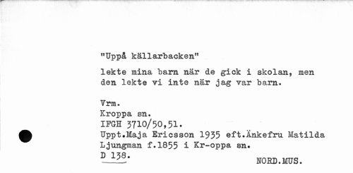 //// r,Uppå källarbacken" //// lekte mina barn när de gick i skolan, men den lekte vi inte när jag var barn. //// Trm. //// Kroppa sn. //// IFGH 3710/50,51. //// ^^ Uppt.Maja Ericsson 1935 eft.Ankefru Matilda //// Ljungman f.1855 i Kr-oppa sn. //// FORD. MUS. ////