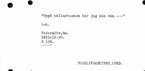 //// "Uppå källarbacken har jag min vän ---" //// Lek. //// Yederslöv,Sm. 5853:18-20. D 138. //// F0LKLI7SÅEKI7ET,LUND. ////