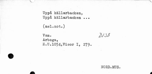 //// I //// Uppå källarbacken, Uppå källarbacken ... //// (mel.not») //// V sm. Arboga, //// S.U.1054»Visor I, 279. //// NORD.MUS. //// ^fe A ////