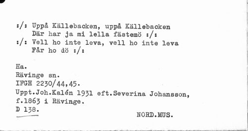 //// Källebacken, uppå Källebacken Där har ja mi lella fästemö :/: :/5 Yell ho inte leva, vell ho inte leva Får ho dö :/: //// Ha. //// Rävinge sn. //// IFGH 2230/44,45. //// Uppt.Joh.Kalén 1931 eft.Severina Johansson, f.1863 i Rävinge. //// HORD.MUS. ////