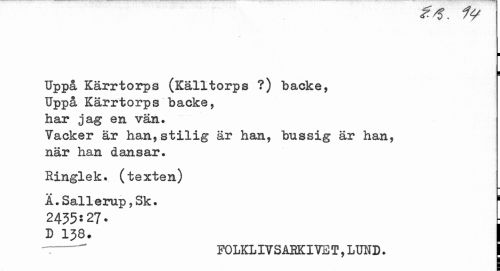 //// << o. /y //// ¦ ¦ //// Uppå Kärrtorps (Källtorps ?) backe, Uppå Kärrtorps backe, har jag en vän. //// Vacker är han,stilig är han, bussig är han, när han dansar. //// Ringlek. (texten) //// Ä.Sallerup,3k. 1 //// 2435:27 * ; //// D 138. I --- FOLKLIVSAEOVET, LUND. ////