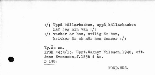 //// i/i Uppå källarbacken, uppå källarbacken //// har jag min vän : /: :/: vacker är han, stilig är han, kvicker är ah när han dansar :/: //// Yg.ls sn. //// IFGH 4434/13- Uppt.Ragnar Nilsson,1940, eft. //// •Anna Svensson,f?1856 i Is. D 138. //// NORD. ros. ////