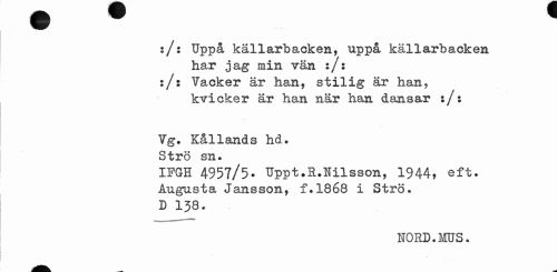//// :/: Uppå källarbacken, uppå källarbacken //// har j ag min vän :/: :/: Vacker är han, stilig är han, //// kvicker är han när han dansar :/: //// Vg. Kållands hd. Strö sn. //// IFGH 4957/5. Uppt.S.Hilsson, 1944, eft. Augusta Jansson, f.1868 i Strö. D 138. //// NOBD.MUS. ////