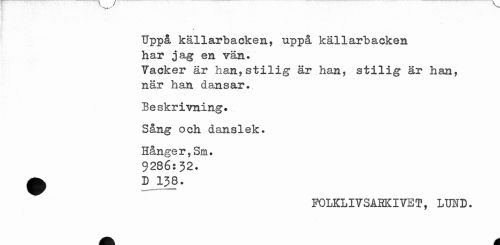 //// Uppå källarbacken, uppå källarbacken har jag en vän. //// Vacker är han,stilig är han, stilig är han, när han dansar. //// Beskrivning. //// Sång och danslek. //// Hånger,Sm. 9286:32. ^ B 138. //// FOLKLIVSÅBKIVET, LUND. //// A M ////