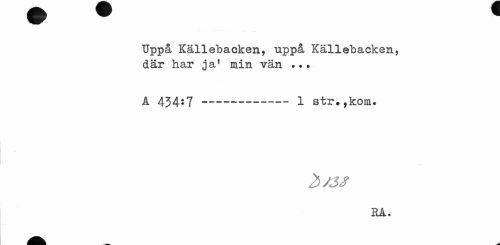 //// Uppå Källebacken, uppå Källebacken, där har jaf min vän . ?. //// A 434*7---— 1 str.,kom. //// 2>J3S //// RA. ////