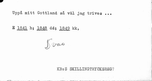 //// Uppå mitt Gottland så väl jag trives ... E 1841 h; 1848 dd; 1849 kk, //// KB:S SKILLINGTRYCKSREG? ////