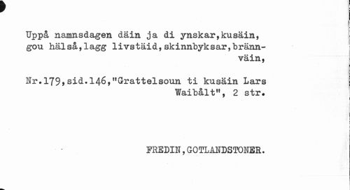 //// Uppå namnsdagen däin ja di ynskar,kusäin, gou hälså,1agg livstäid,skinnbyksar,bränn- i //// väin, //// Hr. 179, sid.l46,lfGrrattelsoun ti kusäin Lars //// Waibålt", 2 str. //// 1 //// F . / //// V //// I //// : //// FEEDIK,GOTLAHDSTONER. ////