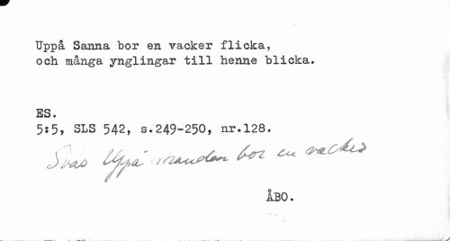 //// Uppå Sanna bor en vacker flicka, och många ynglingar till henne blicka. //// ES. //// 5*5» SLS 542, s.249-250, nr.128. //// ÅBO. ////