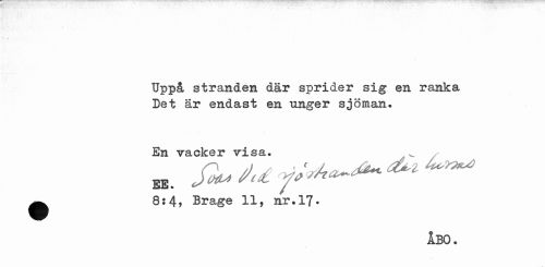 //// Uppå stranden där sprider sig en ranka Det är endast en unger sjöman. //// En räcker visa. . . //// ^^ 8:4, Brage 11, nr.17• //// ÅBO. ////