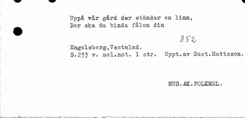 //// Uppå vår gård der ständar en linn, Der ska du binda fålon din //// m //// Engelsb e rg,Ve s tmlnd. //// S.2J3 v. mel.not. 1 str. Uppt.av Gust.Mattsson. //// MUS. AK. POLKMSL. ////