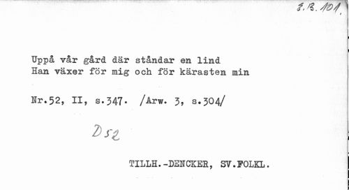 //// (j / o , -Y ls y //// # //// i //// Uppå vår gård där ståndar en lind Han växer för mig och för kärasten min //// Kr.52, II, s.347. /Arw. 3, s.304/ //// ¦ //// TILLH.-DEICKEE, SV.FOLKL. ////