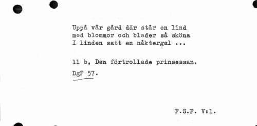 //// Uppå vår gård där står en lind med blommor och blader så sköna //// I linden satt en nåktergal //// II b, Den förtrollade prinsessan. DgF J7 • //// F.S.F. V:1. ////