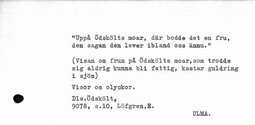 //// "Uppå Ödskölts moar, där bodde det en fru, den sagan den lever ibland oss ännu.ff //// (Visan om frun på Ödskölts moar,som trodde sig aldrig kunna bli fattig, kastar guldring i sjön) //// Visor om olyckor, ^^ Dls.Ödskölt, //// 9078, s.10, Löfgren,E. //// ULMA. ////