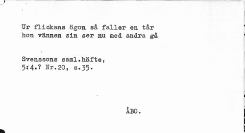 //// * \ • - //// Ur flickans ögon så faller en tår hon vännen sin ser nu meå andra gå //// / //// Svenssons saml.häfte, //// 5*4.? Nr.20, s.35. //// r i //// ÅBO. j ////