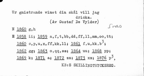 //// Ur gnistrande vinet din skål vill jag //// dricka. (Av Gustaf De Vylder) //// N 1860 g,h //// E 1858 ii; 1859 a,f,t,bb,dd,ff,ll,mm,oo,tt; 1860 c,p,u,x,ff,kk,ll; 1861 f,u,kk,b5; 1862 gg; 1865 o,qq,ss; 1864 uu; 1868 pp; //// 1869 k; 1871 a; 1872 zz; 1875 xx; 1876 p3f //// KB:S SKILLIIGTRYCKSEEG. ////