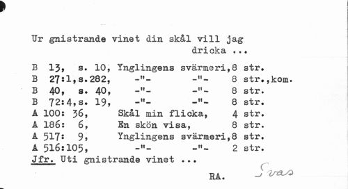 //// Ur gnistrande vinet din skål vill jag //// dricka ... //// B lj, s. 10, Ynglingens svärmeri,8 str. B 27:l,s.282, 8 str»,kom. //// B 40, s. 40, 8 str. //// B 72:4,s. 19, 8 str. //// A 100: 36, Skål min flicka, 4 str. A 186: 6, En skön visa, 8 str. //// A 517s 99 Ynglingens svärmeri,8 str. A 516:105, -»- 2 str. //// Jfr. Uti gnistrande vinet ... //// RA. ^ ////