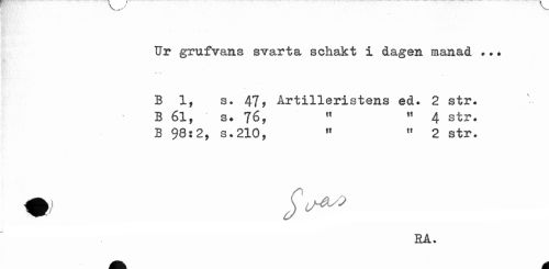 //// Ur grufvans svarta schakt i dagen manad ... //// B 1, s. 47, Artilleristens ed. 2 str. B 61, " s. 76, " n 4 str. //// B 98:2, s.210, " " 2 str. //// RA. //// Éå ////