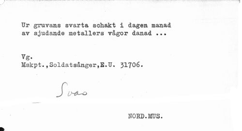 //// Ur gruvans svarta schakt i dagen manad av sjudande metallers vågor danad //// Vg. //// Mskpt.,Soldatsånger,E.U, 31706. //// mm. ms. //// t ////