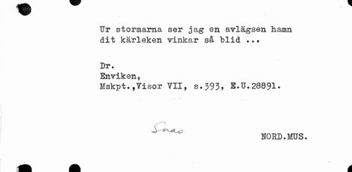 //// Ur stormarna ser jag en avlägsen hamn dit kärleken vinkar så blid ..» //// Dr. //// Enviken, //// Mskpt.,Yisor VII, s.393, E.U.28891. //// NORD.MUS. ////
