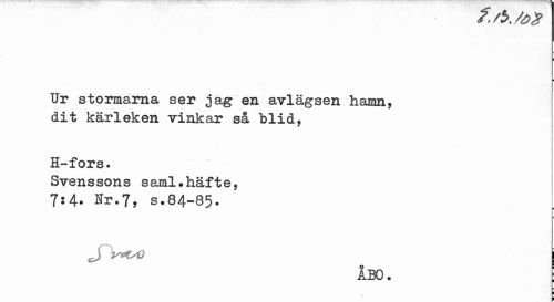 //// ^ /Ä teg //// Ur stormarna ser jagen avlägsen hamn, dit kärleken vinkar så blid, //// H-fors. //// Svenssons saml?häfte, //// 7:4. Ir.7, s.84-85. //// = //// IBO. : //// i l ////