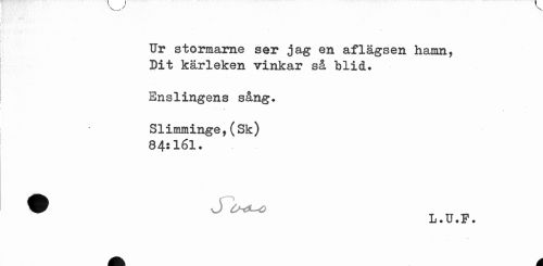 //// Ur stormarne ser jag en aflägsen hamn, Dit kärleken vinkar så blid. //// Enslingens sång. //// «• * //// Slimminge,(Sk) 84:161. //// fV sj //// L.U.P. //// • * //// A A ////