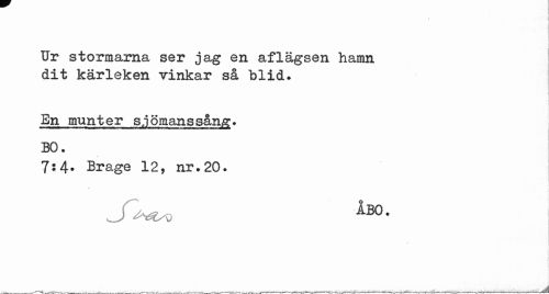 //// I //// Ur stormarna ser jag en aflägsen hamn dit kärleken vinkar så blid. //// En munter s,j ömans sång:» BO. //// 7s4. Brage 12, nr.20. //// ÅBO. ////