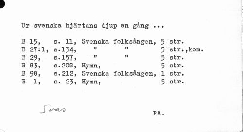 //// Ur svenska hjärtans djup en gång ... B 15, s. 11, Svenska folksången, 5 str. //// B 27:1, S.134, " 11 5 str.,kom. //// B 29, s.157, " ,f 5 str. //// B 83, 8.208, Hymn, 5 str. //// B 98, s.212, Svenska folksången, 1 str. //// B 1, s. 23, Hymn, 5 str. //// RA. ////