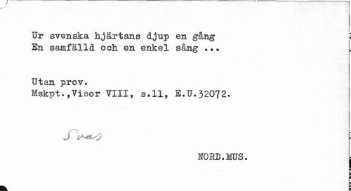 //// Ur svenska hjärtans djup en gång i //// En samfälld och en enkel sång ... //// Utan prov. //// Mskpt.,Visor VIII, s.ll, E.U.32072. //// : //// I0RD.MU3. j ////