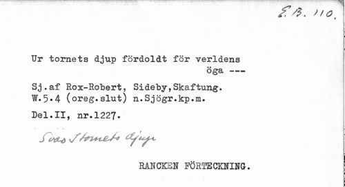//// i //// Ur tornets djup fördoldt för verldens //// öga--- //// Sj.af Rox-Robert , Sideby,Skaftung. W.5*4 (oreg.slut) n.Sjögr.kp.m. //// Del.II, nr.1227. //// RANCK3N FÖRTECKNING. ////