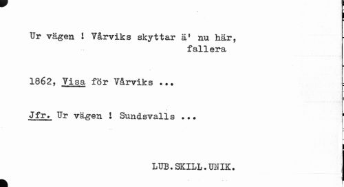 //// ¦ //// Ur vägen I Tårviks skyttar äf nu här, //// fallera //// i //// 1862, Visa för Vårviks ... //// i //// Jfr. Ur vägen 1 Sundsvalls s //// c.: " //// F //// LUB.SKILL.UUIK. //// k ////