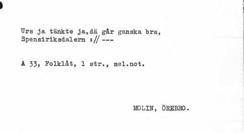 //// ) i //// Urs ja tänkte ja,dä går ganska bra, Spensiriksdalern :// —— //// A 33, Folklåt, 1 str», mel.not. //// MOLIN, ÖREBRO. ////
