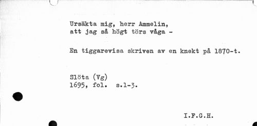 //// Ursäkta mig, herr Ammelin, att jag så högt törs våga - //// En tiggarevisa skriven av en knekt på 1870-t. Slöta (Vg) //// 1695* fol. s.1-3. //// I • 3? • Gr • H* //// M ////